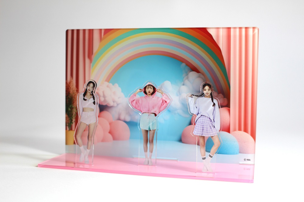 各種スタンドと背景と台座がセットになったジオラマ風のアクリルスタンドセットです。背景をライブステージにしてアーティストやアイドルグループのスタンドを好みの位置に配置したり、アニメの登場キャラクターを集結したプレミアム商品なども製作する事ができます。フルカラー印刷のため写真やグラデーションも印刷できます。白を引かない部分はクリアなデザインにする事ができます。またキャラクター・写真などのデザインに合わせてカットすることが可能です。インクジェット印刷は版を作成する必要がないため、初期費用がかからず小ロットでも安価でご提供できます。また生産国が日本のため納期もスピーディに対応が可能です。 その他の印刷法は高精細のオフセット印刷もご対応可能です。生産は中国工場になるため納期や最低ロットは変わりますが、色指定のある版権キャラなどの販売グッズに最適です。