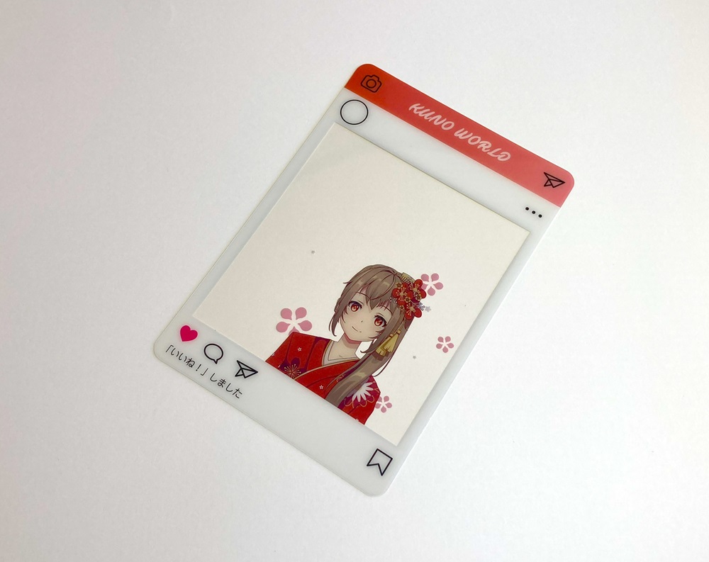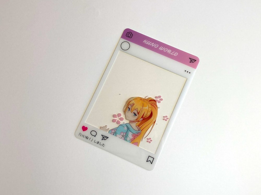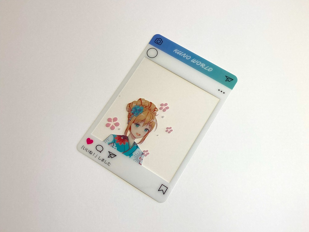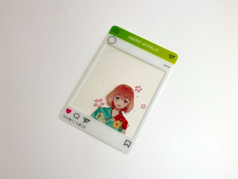まるでSNSに投稿しているかのような写真が撮れるクリアカードです。 景色などの背景と一緒に好きなキャラクターと写真を撮れるアイディア商品です。絵柄をハッキリとさせたいキャラクター部分などには白を引きます。白を引かない部分はクリアなデザインにする事ができます。またカードとしても使用することができますので、使い方は様々です。印刷は高精細のフルカラーオフセット印刷なので写真やグラデーションのある繊細なデザインや鮮やかなカラーも高品質に再現します。 形状は基本既存型を使用しますが、型を起こしてお好きな形状にダイカットする事もできます。コレクショングッズなどとして今流行りの商品です。