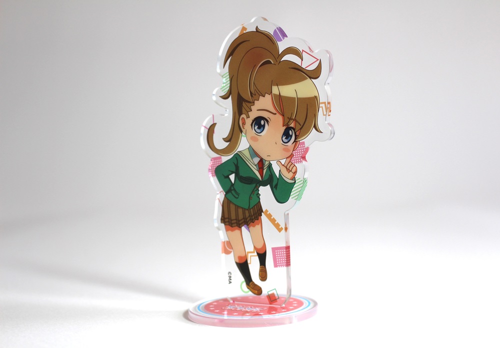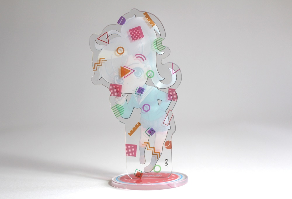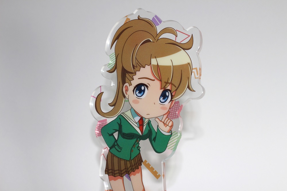 高精細のフルカラー印刷を施したアクリルスタンドに両面印刷が出来ます。裏面(2層目)に白引きをしなければ表面から裏面のデザインが透けて見えるため、2層でのデザイン表現が可能です。印刷は高精細のフルカラーオフセット印刷なので写真やグラデーションのある繊細なデザインや鮮やかなカラーも高品質に再現します。また印刷面が内側になり保護されるため印刷が削れず劣化が少ない商品です。カット面も仕上がりが滑らかで触り心地も良く綺麗です。オフセット印刷はクオリティが高く、他の印刷法とは一味違う美しさと鮮やかさがあるため色指定のある版権キャラや肖像などの販売グッズに最適です。