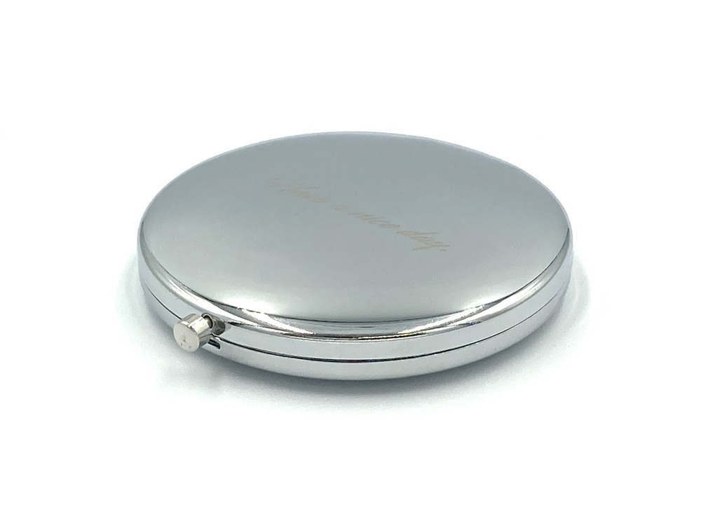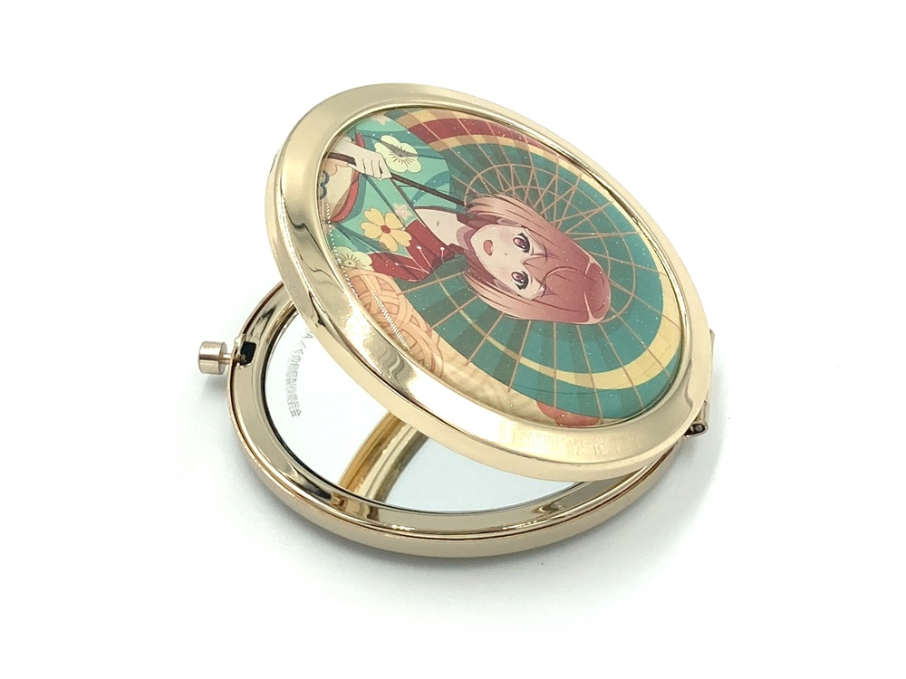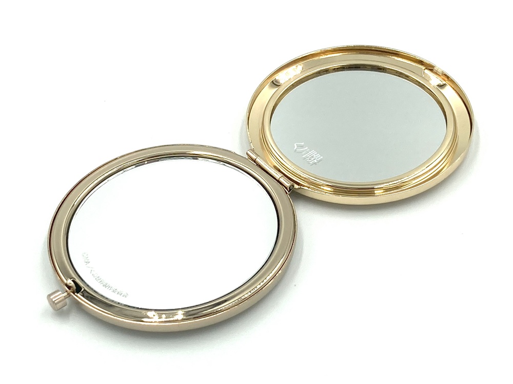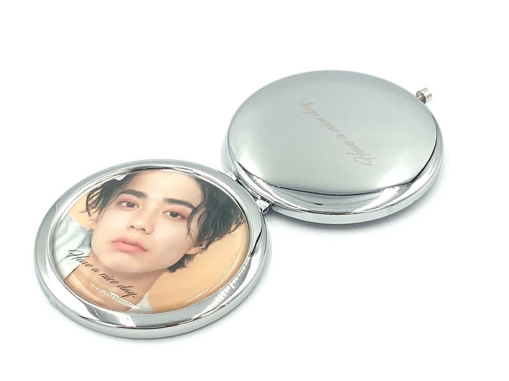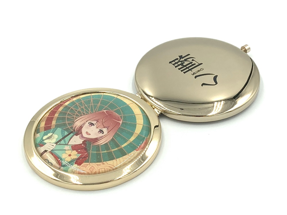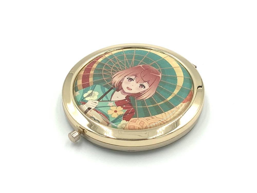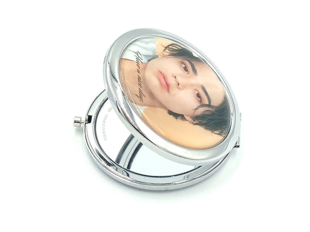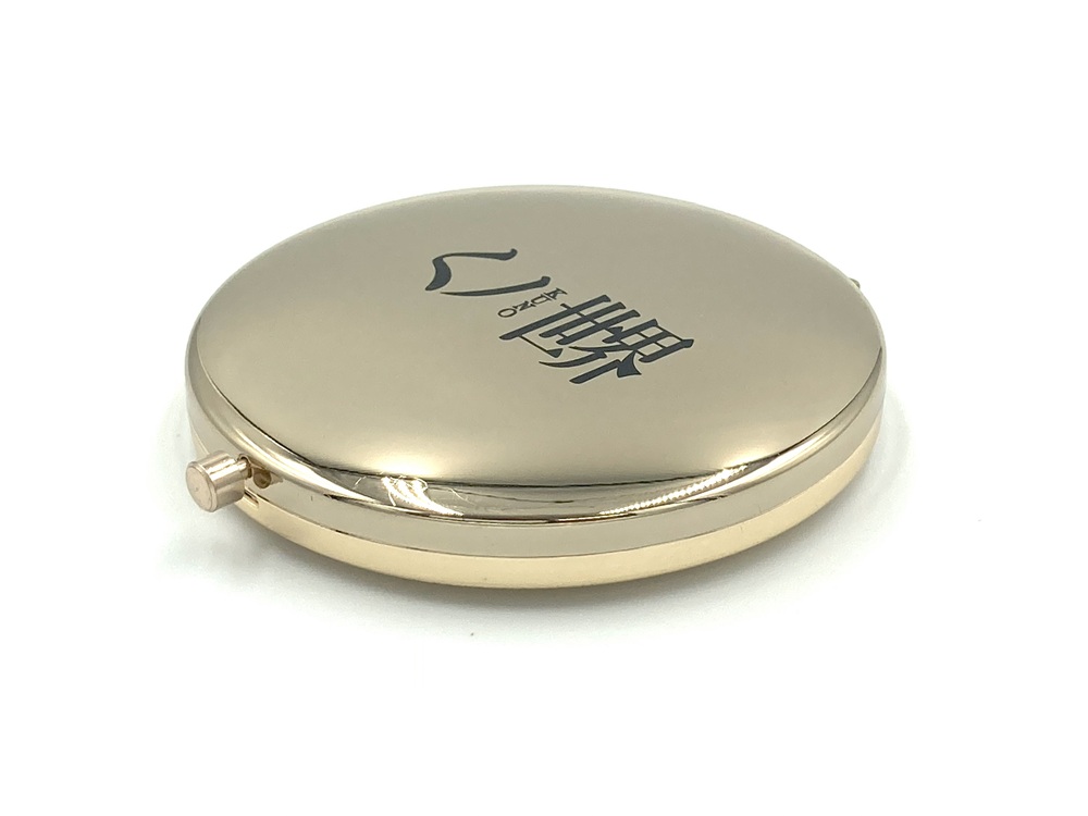 重量感があって厚みがある丸型のコンパクトミラーにオリジナルデザインでフルカラー印刷ができます。本体に厚みがあるため高級感があります。ミラーは通常の鏡+拡大鏡がセットになっております。ボタンを押すとミラーが開くため使いやすくメイクやお手入れがしやすいコンパクトミラーです。またボタンにはストーンを付ける事もできますのでボタンがキラキラと光る仕様にする事もできます。印刷は高精細のフルカラーオフセット印刷なので写真やグラデーションのある繊細なデザインや鮮やかなカラーも高品質に再現します。また印刷面にはコーテイングとして透明エポを施しますが、キラキラと光るラメ入りも可能です。裏面にはロゴなどをシルク印刷で印刷できます。またミラーにもシルク印刷が可能なためデザインの幅が広がります。アパレル・コンサート・アニメなど様々なジャンルで好評頂いております。本体製作のミニマムロットは1,000pcsですが、デザインで分ける事が可能です。 例)4デザイン×250pcs=1,000pcs