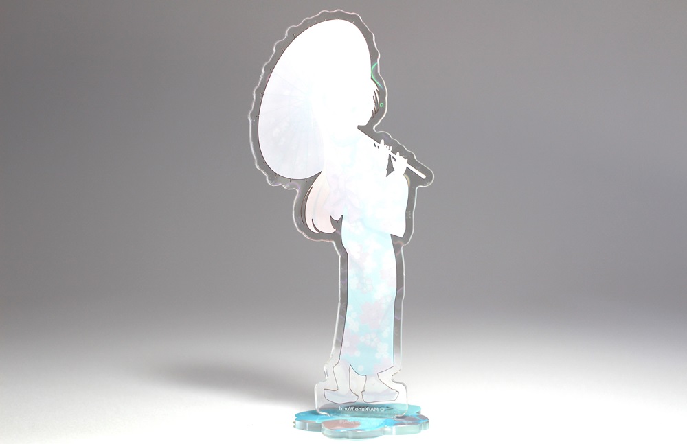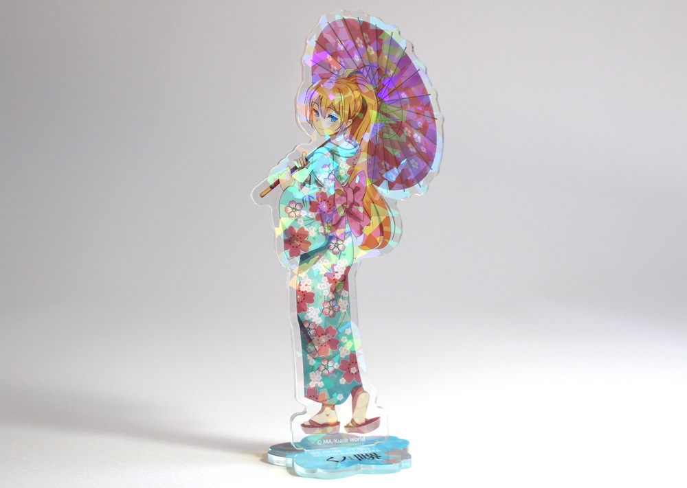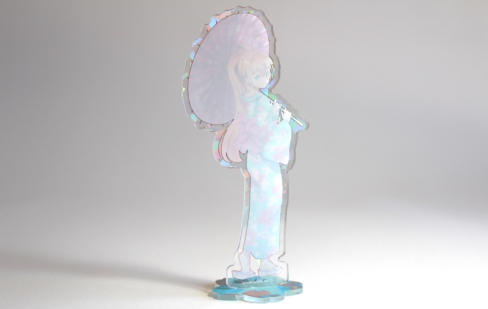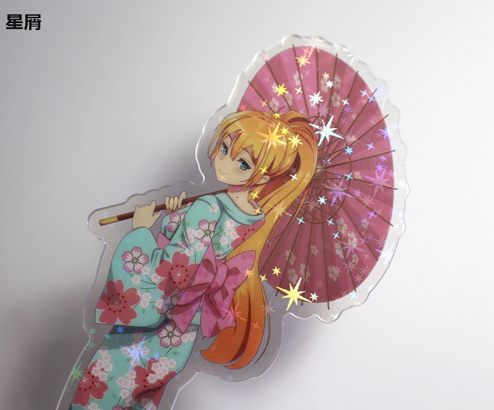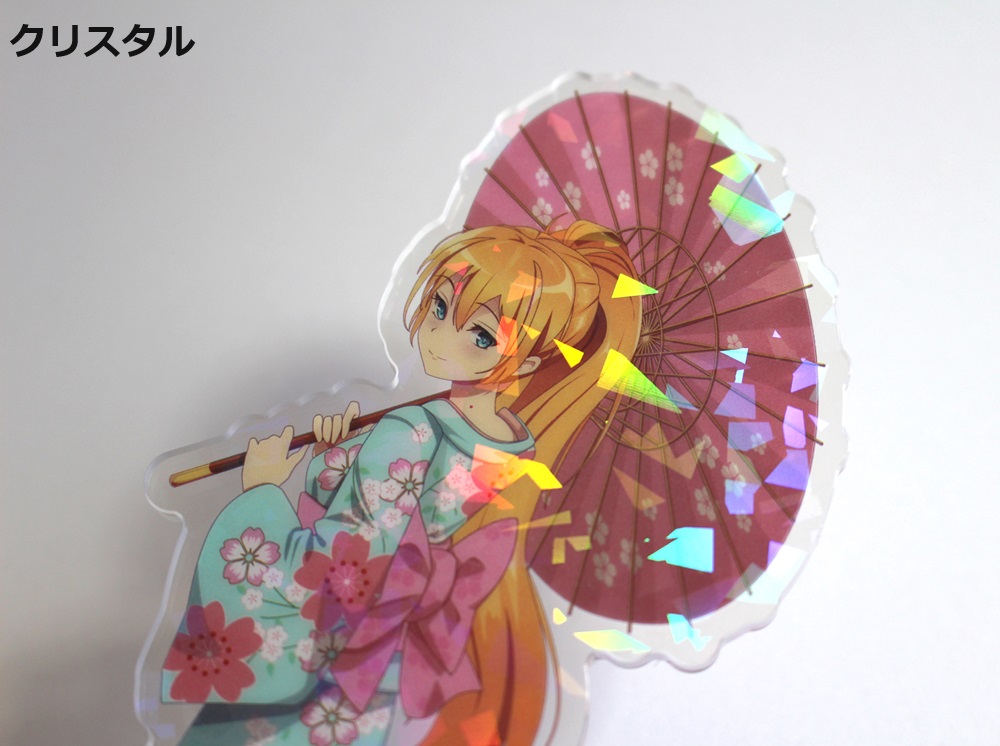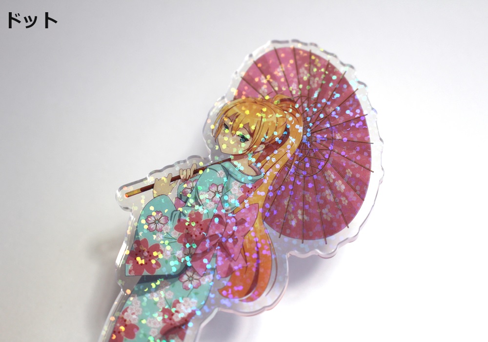ホログラムを表面に施したアクリルスタンドです。見る角度によってホログラムの色や見え方が変わりキラキラと輝くので、とても綺麗でプレミアム感のある商品です。印刷は高精細のフルカラーオフセット印刷なので写真やグラデーションのある繊細なデザインや鮮やかなカラーも高品質に再現します。また印刷面が内側になり保護されるため印刷が削れず劣化が少ない商品です。カット面も仕上がりが滑らかで触り心地も良く綺麗です。インクジェット印刷とは一味違う美しさと鮮やかさがあるため色指定のある版権キャラなどの販売グッズに最適です。ホログラム加工は他のアクリル商品にもご対応可能です。