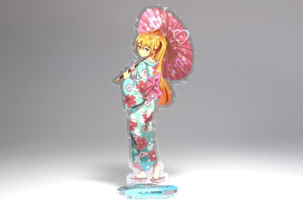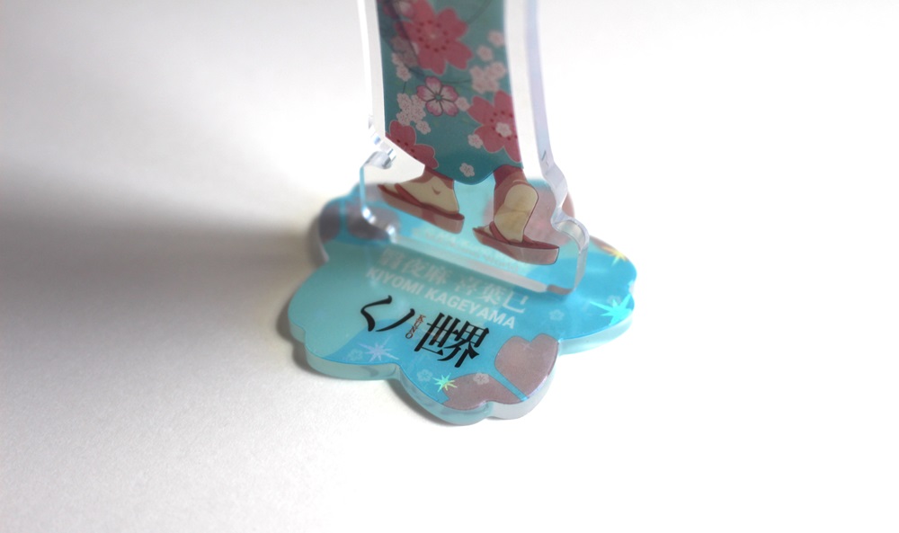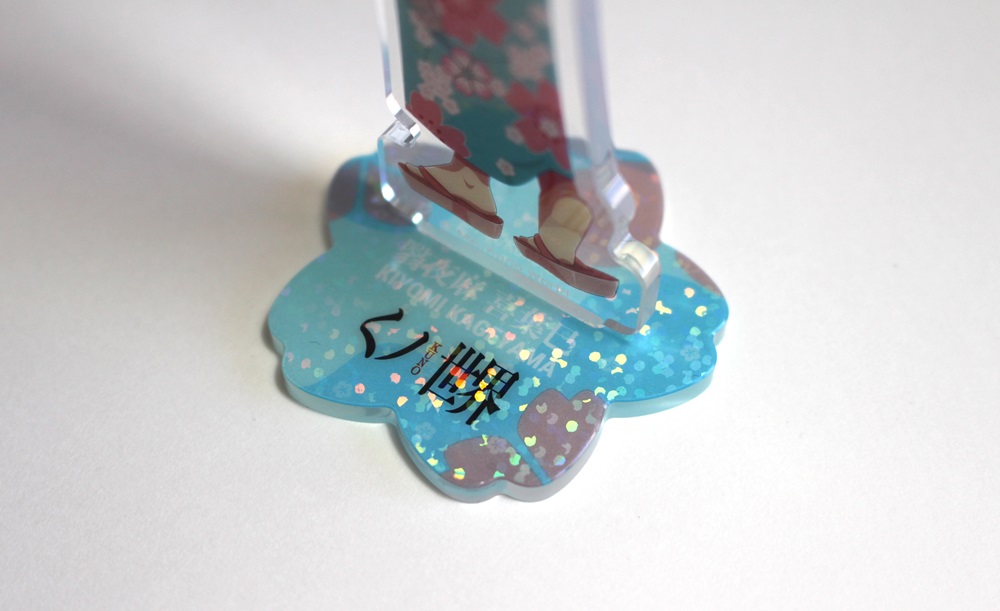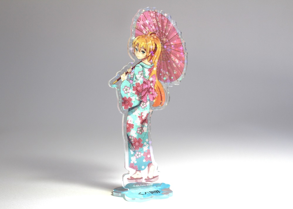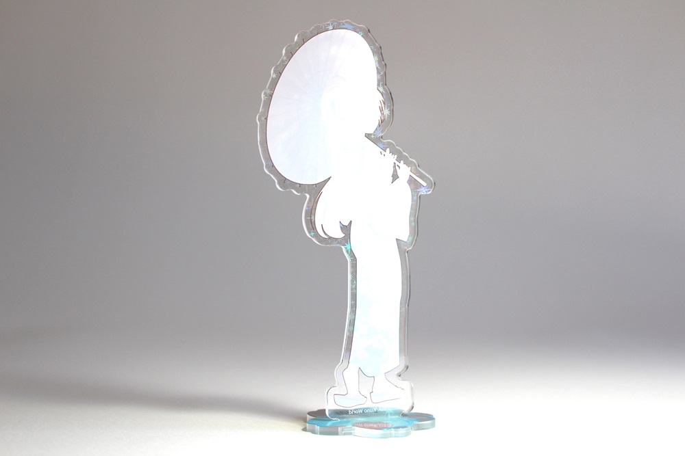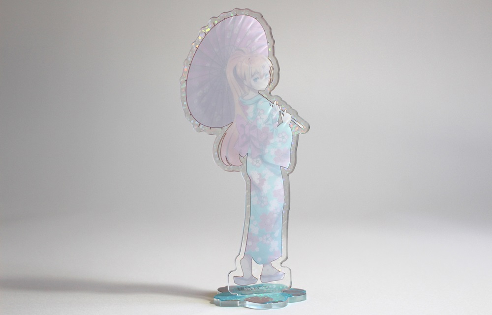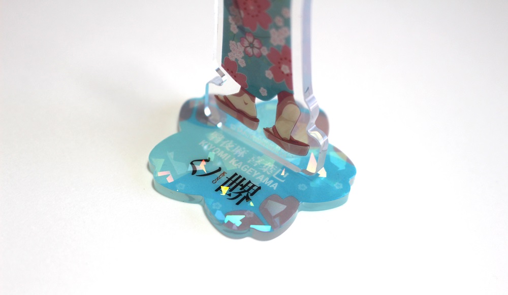 ホログラムを表面に施したアクリルスタンドです。見る角度によってホログラムの色や見え方が変わりキラキラと輝くので、とても綺麗でプレミアム感のある商品です。印刷は高精細のフルカラーオフセット印刷なので写真やグラデーションのある繊細なデザインや鮮やかなカラーも高品質に再現します。また印刷面が内側になり保護されるため印刷が削れず劣化が少ない商品です。カット面も仕上がりが滑らかで触り心地も良く綺麗です。インクジェット印刷とは一味違う美しさと鮮やかさがあるため色指定のある版権キャラなどの販売グッズに最適です。ホログラム加工は他のアクリル商品にもご対応可能です。