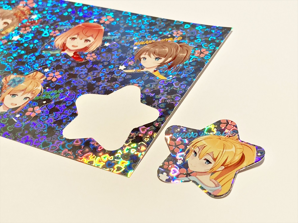 オリジナルデザインのステッカーをお好きな形状にハーフカットする事ができます。印刷は高精細のフルカラーオフセット印刷なので写真やグラデーションのある繊細なデザインや鮮やかなカラーも高品質に再現します。表面加工は全面にPP貼りが可能で、光沢のあるグロスPPや艶消しのマットPPがあります。また見る角度によってキラキラと輝くホログラムPPも可能です。また素材も通常のタック紙の他にホログラム紙もあります。ホログラム紙の場合は紙の上から印刷するため、白引きをすれば絵柄にはホログラムがかからない仕様にすることができます。イベント会場のPRグッズ・特典グッズやコレクショングッズとして大人気の商品です。